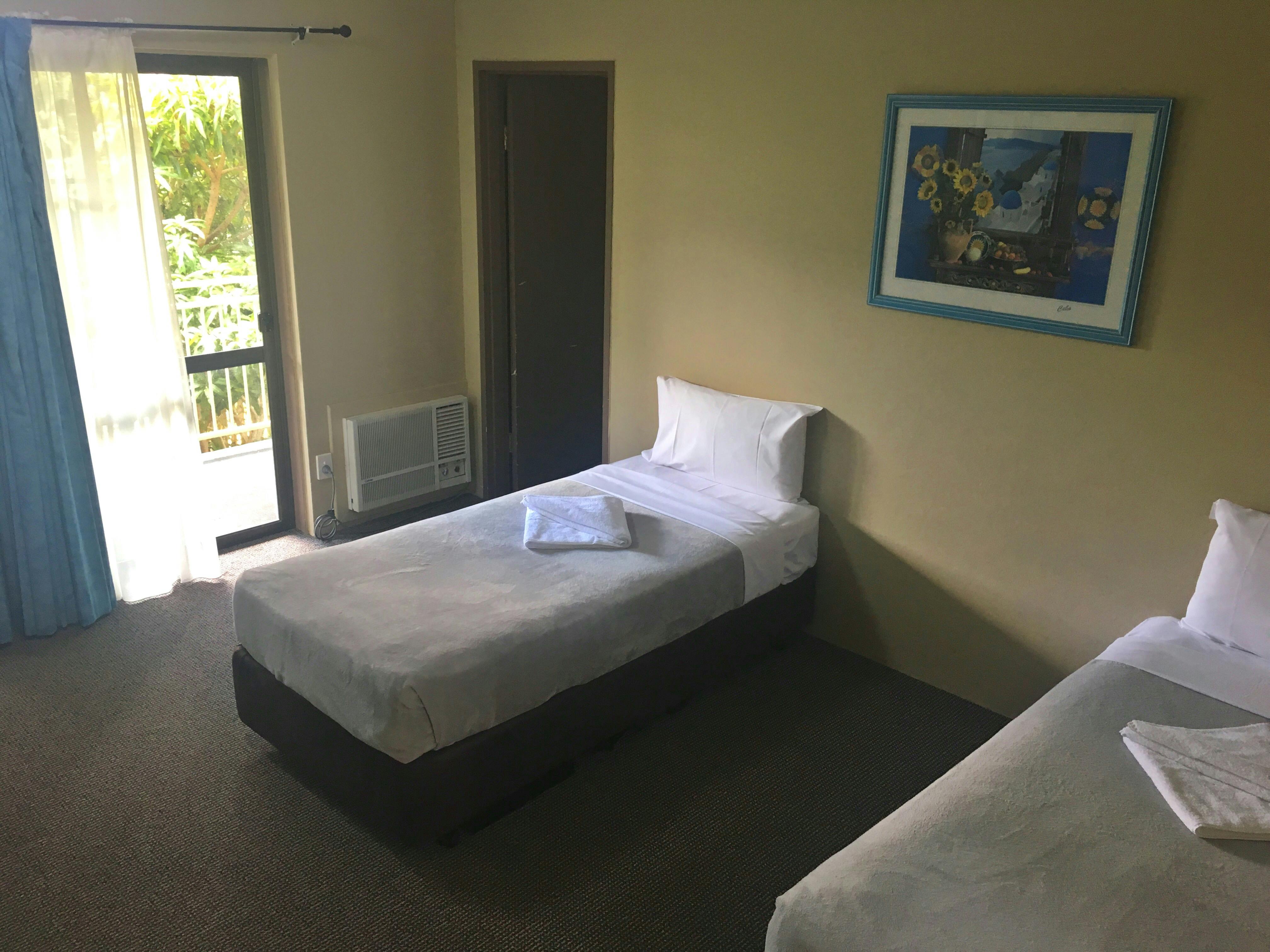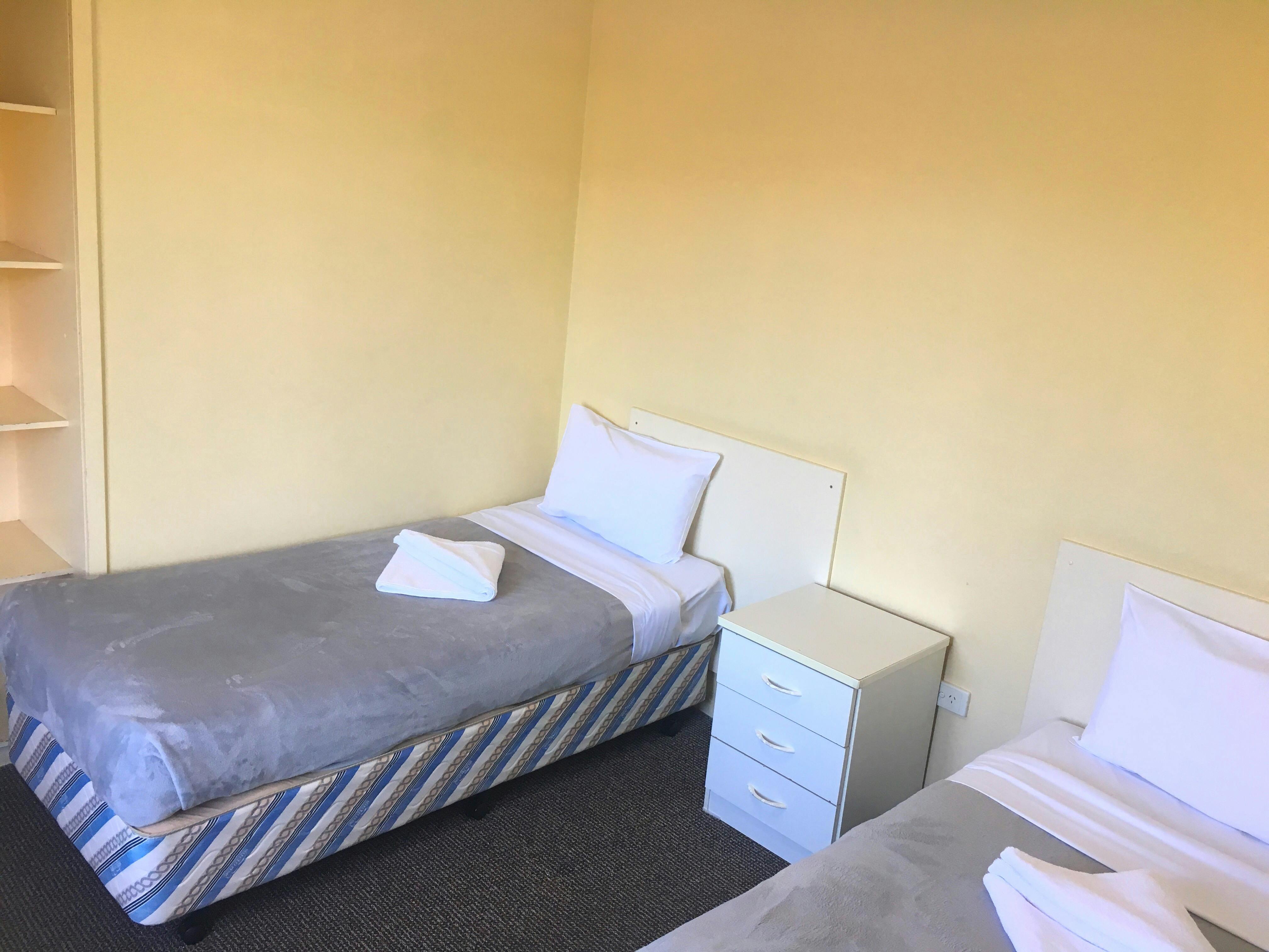 1 Queen Bed and 2 Single Beds in two seperate rooms.